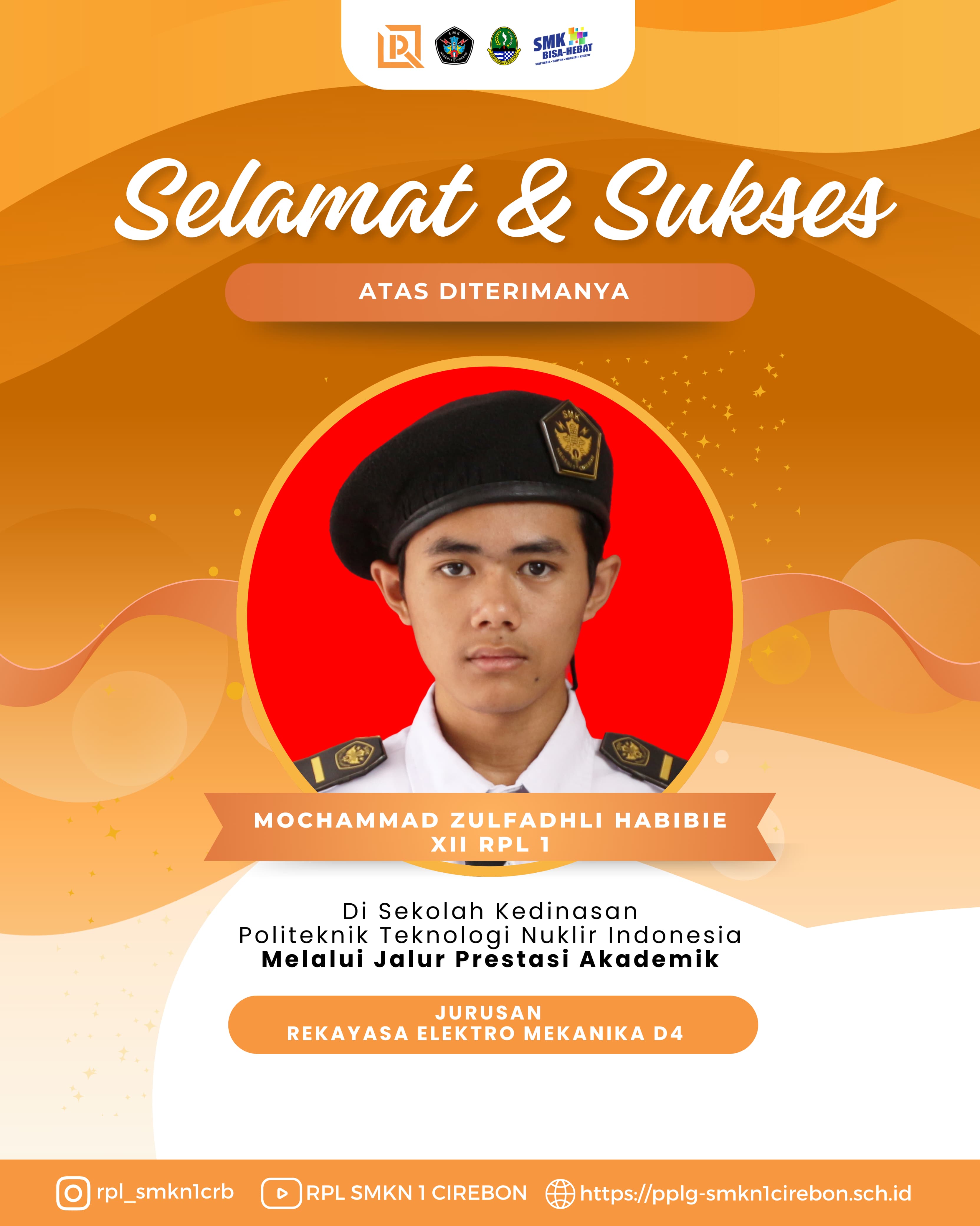 Selamat dan Sukses! Mohammad Zulfadhli Habibie (XII RPL 1) berhasil lolos ke Politeknik Teknologi Nuklir Indonesia melalui Jalur Prestasi Akademik. Jurusan: Rekayasa Elektro Mekanika D4